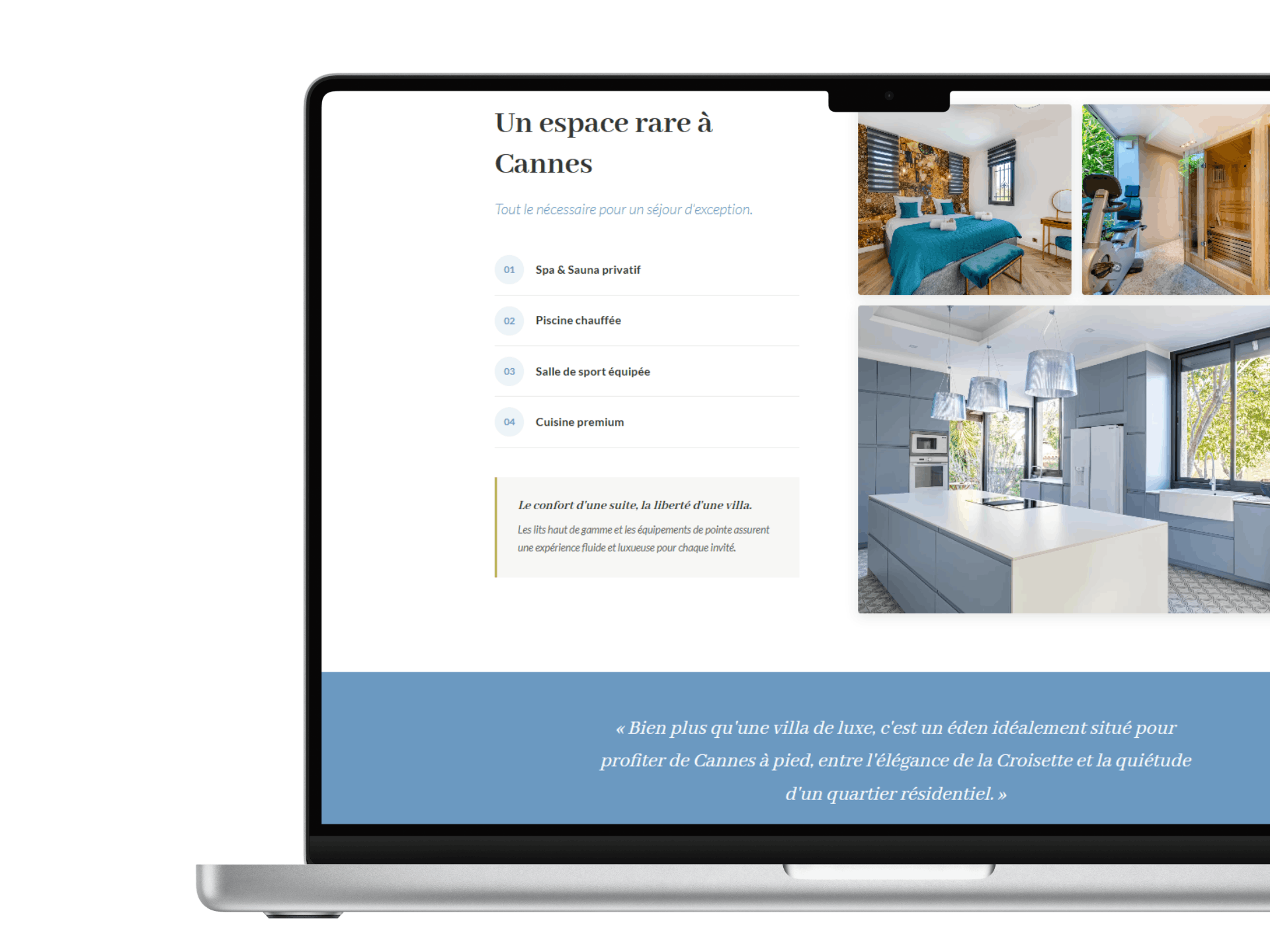 Vous faites ce que vous voulez. Vous valorisez votre villa comme bon vous semble. Un site élégant met en avant son caractère haut de gamme.